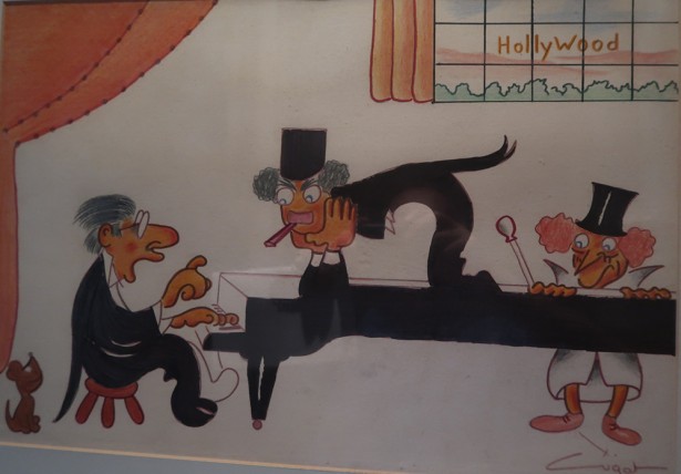 Dibuix de Xavier Cugat, amb la caricatura del mateix Cugat al piano, i els germans Grouxo i Harpo Marx, regalat a Maurici Rosell
