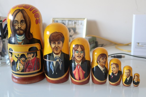 Matrioxca amb els components i col·laboradors de la banda.