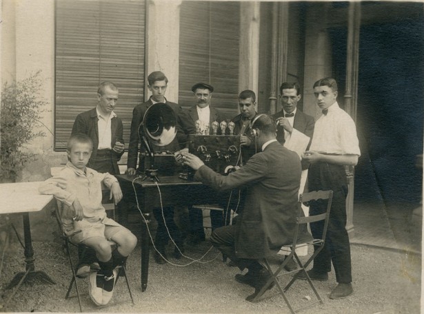Any 1924. Grup d'iniciadors de Ràdio Club Manresa escoltant emissores estrangeres al pati de l'Ateneu Obrer Manresà. En primer terme, assegut d'esquena, Antoni Garriga Coll, nascut el 1876, propietari de l'aparell que funcionava amb làmpades
