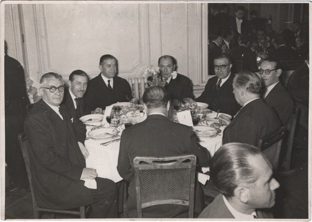 11 de gener de 1944. Junta de Ràdio Club Manresa, amb el director Josep Mira, el president Maurici Perramon, Josep Augé, Pere Ausió Rovira, Agustí Coll, Pere Garriga Hornosa, Celestí Junyent, Eduard Puig Sieres, Pere Vidal Bonastre Foto: Arxiu de Pere Garriga Giralt