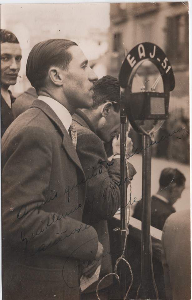 Any 1944. Targeta postal de Josep Mira transmetent un acte a l'exterior per a Ràdio Manresa, amb el micròfon Foto: Arxiu familiar de Montserrat Mira