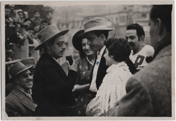 Desembre de 1956. Imatge del Festival de Premsa i Ràdio al camp de futbol del Pujolet per recaptar diners per la campanya benèfica. A l'esquerra, assegut, Josep Mira. Al cecntre, Juan Luis Suari Toset, excepcional actor de doblatge de Radio España de Barcelona Foto: Arxiu familiar de Montserrat Mira