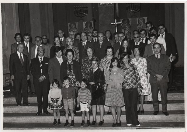 28 de setembre de 1974. Festa patronímica de sant Gabriel a Crist Rei amb directius, tècnics, locutors i col·laboradors Foto: Fotografia Villaplana Vargas, arxius de Pere Garriga i de Montserrat Mira