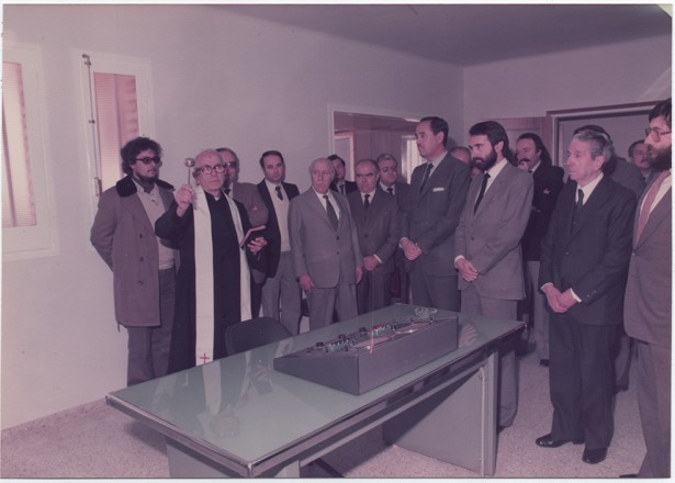 7 de març de 1984. Acte d'inauguració del centre emissor de Ràdio Manresa al polígon de Bufalvent, amb la presència de Xavier Domènech, mossèn Jaume Franquesa, Josep Mira, Antoni Garriga, el director general de la cadena SER, l'alcalde Joan Cornet, Enric Corrons i Ramon Puig Foto: Fotografia Vert, arxiu de Pere Garriga