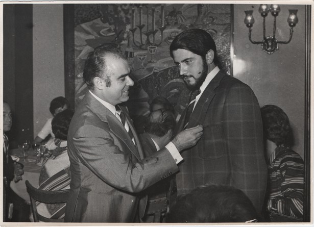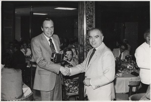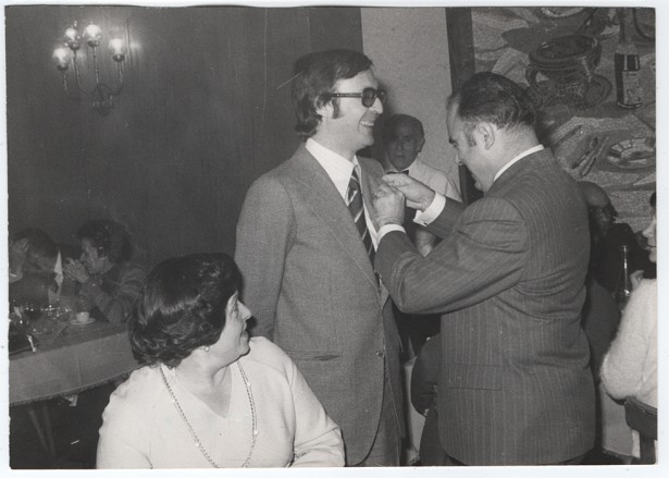 8 d'octubre de 1976. Garriga condecora el col·laborador Ferran Sánchez Agustí, de Sallent, al restaurant Lice, en la festa patronal Foto: E. Vilaplana, arxiu de Pere Garriga