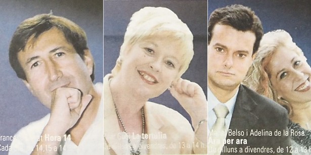 Octubre del 2003. Retrats dels locutors en un anunci de la ràdio: Joan Antoni Lozano, Pilar Goñi, i Manel Belso i Adelina de la Rosa Foto: Revista Freqüència