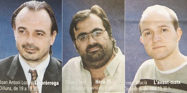 Octubre del 2003. Retrats dels locutors en un anunci de la ràdio: Eduard Font, Ernest Macià i Francesc Serrano Foto: Revista Freqüència