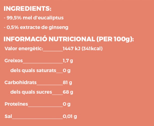 El producte conté mel i extracte de ginseng. Incloure ginseng en quantitats tan petites (0,5%) acostuma a ser una estratègia de màrqueting i de ben segur l’impacte real d’aquest ginseng en la salut és simbòlic. La combinació mel i ginseng, però, sona més saludable i exòtica, cosa que en millora la percepció per part dels consumidors. La mel tampoc no conté greixos de forma natural. Per tant, la seva presència a la taula nutricional s’explica pel ginseng amb força probabilitat. Tot i tenir pocs ingredients, la mel amaga més sorpreses. La norma de qualitat actual relativa a la mel deixa clar que no es pot fer dir mel a un producte en què hi ha mel i algun altre ingredient. Al frontal del pot de mel que analitzem avui diu “Mel d’eucaliptus amb ginseng”. En sentit estricte, no compleix la normativa d’etiquetat: el frontal hauria d’indicar que és una “preparació de mel amb ginseng”. Per tant, a l’hora de comprar mel, si és mel pura ha d’indicar mel d’eucaliptus, de romaní, de farigola, etc... i res més. Si el pot diu “mel amb ginseng, amb pròpolis, o, per exemple, amb llimona”, seria una preparació de mel amb més coses, no mel pura.