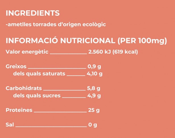 Aquesta crema està elaborada exclusivament amb ametlles torrades de procedència ecològica. Com que només conté ametlles no hi ha rastre de sucres afegits ni sal. Només conté ametlla 100% natural processada mitjançant un procés de trituració. Del perfil nutricional, cal destacar que és una font important de greixos saludables. De fet, el contingut en greix saturat —el més perjudicial per a la salut— és de només 4,10 g respecte del total de 53 g de greix. A més, independentment del format de presentació, els fruits secs tenen un elevat contingut en proteïnes d’origen vegetal. Tot i que no apareix a l’etiqueta, la crema d’ametlles és rica en vitamina E, un potent antioxidant que protegeix les cèl·lules de l’estrès oxidatiu; vitamines del grup B, essencials per al metabolisme energètic; i minerals com el magnesi, el calci i el ferro, que contribueixen al bon funcionament muscular i a la salut dels ossos. Quant a la fibra, les ametlles crues són una opció més aconsellable que la crema d'ametlles. La pell marró exterior de les ametlles conté una part significativa de fibra insoluble que acostuma a perdre's durant el procés de molta per fer la crema. La crema, però, conté sobretot fibra soluble, un tipus de fibra que es dissol parcialment en aigua i també aporta beneficis. Tot i ser nutricionalment interessants, les cremes de fruits secs són aliments molt calòrics. Per això, cal consumir-les amb moderació. Una ració recomanada seria d’1 o 2 cullerades al dia per no sobrepassar les necessitats calòriques, però cal individualitzar els casos. També cal considerar la relació entre el contingut d’àcids grassos omega-3 i omega-6 que aporta l’ametlla. Sencera o en format crema, aquest fruit sec té un alt contingut d'omega-6, però és pobre en omega-3. Aquest desequilibri podria ser problemàtic si a la dieta ja hi ha un excés d'omega-6, ja que en quantitats elevades aquest omega pot tenir un efecte proimflamatori.