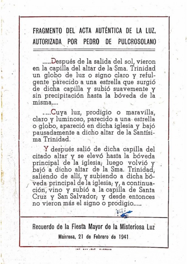Fragmento del acta auténtica de la luz, autoritzada por Pedro de Pulcrosolano, un nom que fa molt per a un personatge il·lustre que, segons consta en les cròniques, era el notari de l’època que va donar fe del miracle (1345).