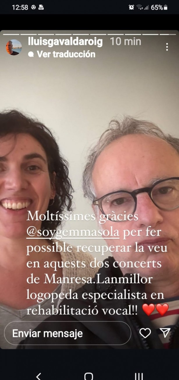 El dijous 20 de març i el divendres 21, Els Pets van actuar al Kursaal amb un ple absolut i un èxit apoteòsic. Però segur que el que més recordarà el Lluís Gavaldà d’aquella estada a Manresa seran els problemes de veu, a causa d’una afonia, amb els que va haver d’encarar els dos concerts. Per parar el primer cop dijous va anar d’urgències a Sant Joan de Déu i allà el van medicar per sortir del pas. Però divendres va rebre una ajuda suplementària tan oportuna com inesperada. Va ser la que li va brindar la logopeda Gemma Solà, que es va posar en contacte amb ell per donar-li un cop de mà. Gràcies als exercicis vocals que li va proposar la Gemma, el cantant d’Els Pets va poder trampejar molt millor aquella situació i li ho va voler agrair públicament penjant aquest missatge a la seva història d’Instagram. El Lluís va recuperar la veu i la Gemma es devia quedar sense paraules.