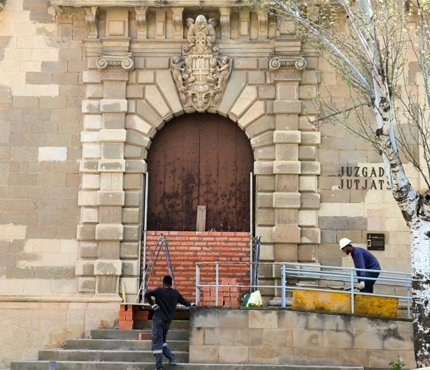 El mateix 10 d’abril una lectora de la revista va capturar aquest imatge d’uns operaris tapiant la portalada principal de l'antic edifici dels jutjats, a la baixada de la Seu. Sembla que ho ha fet fer l’Ajuntament, per evitar que les persones amb adiccions l'usin com a espai de consum i per garantir-hi la seguretat, però que els antics jutjats s’hagin d’emparedar per evitar problemes no deixa de tenir la seva gràcia...