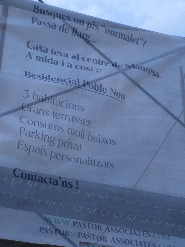 Això ve a dir la pancarta que anuncia un edifici de nova construcció en un solar del carrer Major del Poble Nou, que s’anomena Residencial Poble Nou: “Si busques un ‘pis normalet’, passa de llarg”. Com a estratègia publicitària, segur que funciona. Si més no, fa rumiar.