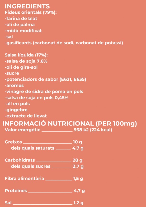 Els fideus, que representen gairebé el 80% del producte, es fabriquen amb farina de blat i oli de palma. Aquest últim és un greix molt utilitzat per la seva estabilitat i baix cost, però altament saturat. No és el millor aliat per a una dieta saludable. La salsa de soja líquida, l'ingredient destacat en sabor, conté diversos potenciadors com el glutamat monosòdic (E621) i l’E635, habituals en menjars processats per intensificar el gust. El glutamat pot provocar mal de cap i molèsties intestinals si es consumeix en excés, sobretot en persones sensibles, motiu pel qual és un ingredient que convé evitar. També hi trobem aromes amb derivats làctics i edulcorants com la maltodextrina. Addicionalment, un producte que teòricament és de pollastre només l’inclou en una proporció insignificant (0,7%), cosa que difícilment aportarà beneficis nutricionals reals.