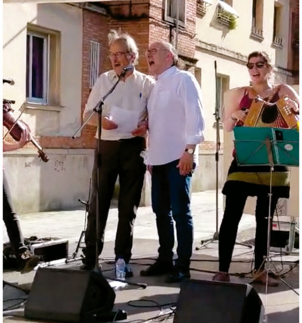 No sempre tenim l'oportunitat de veure els nostres companys fent el carallot pels carrers i places de Manresa. Però ens ha fet gràcia aquesta instantània de la festa d'aniversari de la Residència d'Avis Sagrada Família on es veuen Rossend Coll —habitual de l'acordió i la gresca— i Ramon Fontntdevila cantant a duo les Rondes del vi, acompanyats pel grup Les Argelagues.