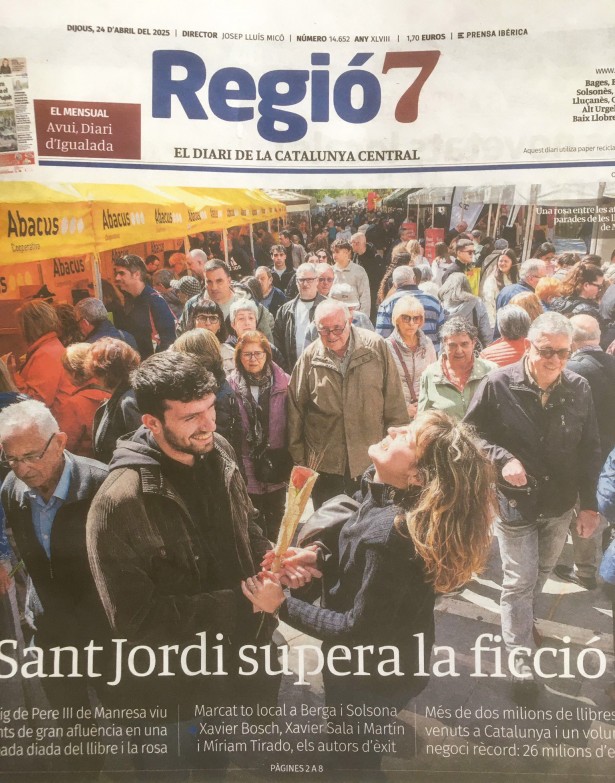 Regió7 de l’endemà de Sant Jordi publicava en portada una fotografia del Passeig de Manresa en plena ebullició durant la Diada. L’anècdota curiosa és que entre les persones anònimes que hi sortien retratades hi havia l’excap de Fotografia del diari i actualment president de l’Associació Memòria i Història, Salvador Redó. Sort que la situació no era pas gens compromesa...