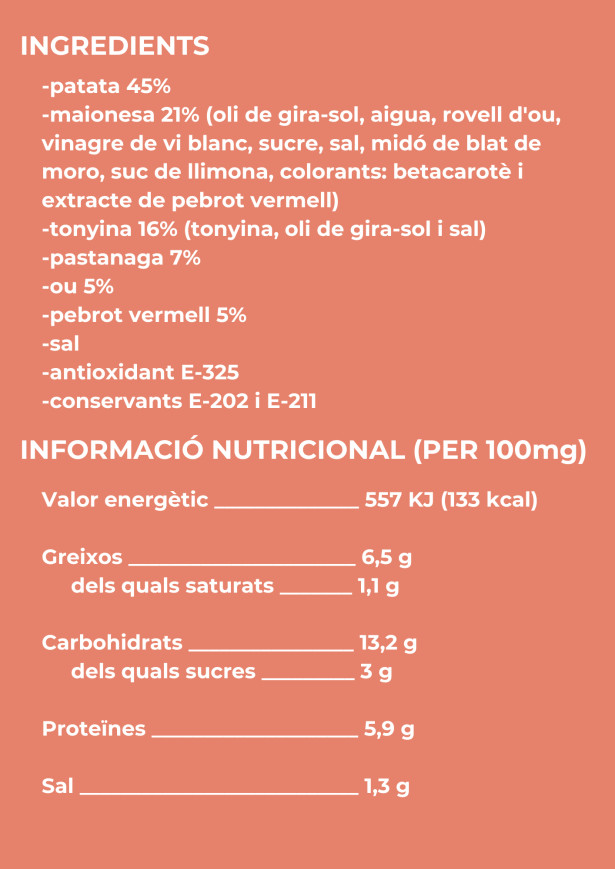 L’etiqueta analitzada correspon a una ensalada russa comercialitzada per una gran cadena de supermercats. El producte conté, sobretot, patata i maionesa amb una proporció d’un 45% i 21% respectivament. Quant als ingredients de la maionesa, cal destacar que l’oli de gira-sol —habitualment utilitzat per abaratir costos— no és el millor dels olis pel seu potencial efecte proinflamatori. A més, s’hi afegeix sucre i midó, ingredients del tot innecessaris en una maionesa tradicional, així com colorants que no aporten cap benefici nutricional. Per tant, es tracta d’una maionesa altament processada, amb una qualitat grassa escassa i amb afegits que redueixen notablement el valor nutricional del producte. Pel que fa al contingut proteic, el principal contribuent és la tonyina, ja que l’ou té una presència molt baixa, amb un contingut de només un 5%. També cal destacar que l’única verdura present és el pebrot vermell i la pastanaga, també en quantitats força reduïdes.