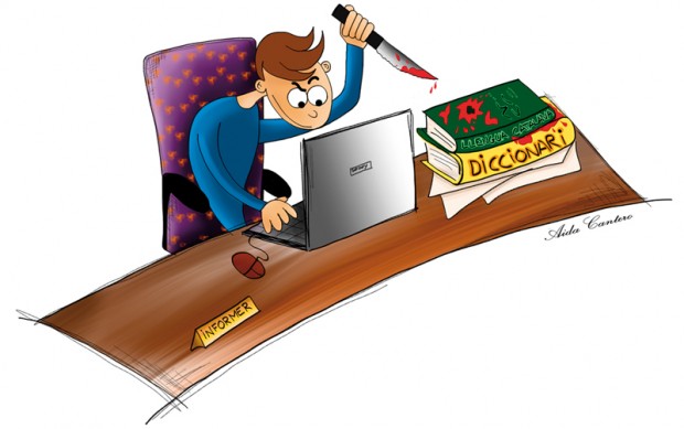 informer i es vehicula a través d’espais com el Facebook. La idea és semblant a la de les guixades dels interiors de les portes dels lavabos, però modernitzada. Ben mirat, falòrnies infundades aparentment inofensives que acaben escampant-se com la pólvora. I, certament, algunes fan molt de mal. És esfereïdor comprovar com, en els centres de secundària, la testosterona està a uns nivells altíssims! De cordar-se ben fort un cilici a l’entrecuix, vaja! Que Déu ens agafi confessats! Ara que, el que enerva més és el llenguatge i l’ortografia dels adolescents. No és pas un problema de llengua, ni de sociolingüística... És un problema d’alfabetització. Cada dia reso 25 parenostres i 50 avemaries per als docents que han de negociar-hi. Alguns d’ells, per cert, vexats i insultats als