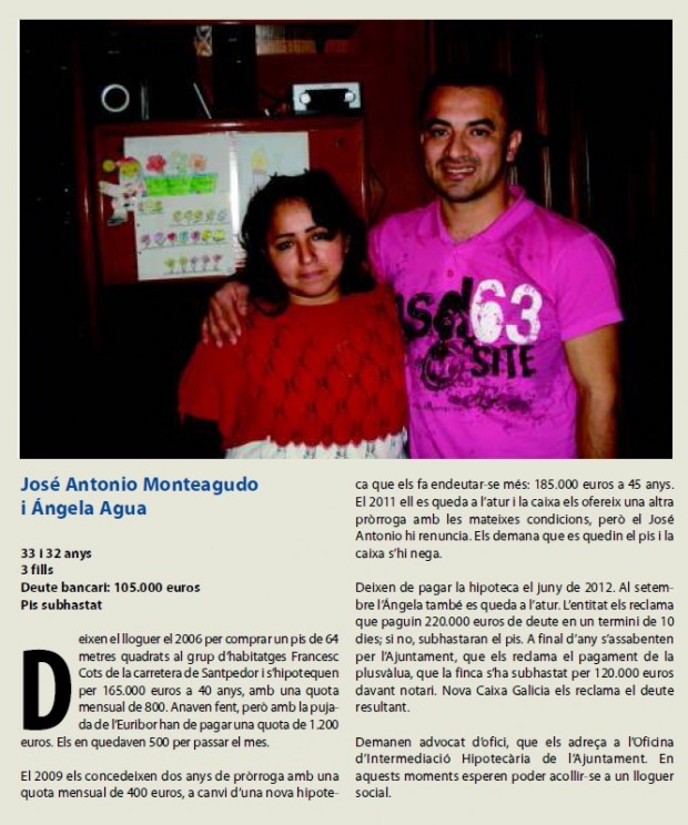canvi d’actitud en la banca, però tot està molt verd, de manera que l’amenaça del desnonament encara és viva.El José Antonio no es pensava que es quedaria sense feina, ni tampoc que les coses anirien tan malament, «però com que tothom comprava, nosaltres ho vam voler provar. Teníem la il·lusió de tenir una propietat, i si un dia no podíem pagar-la pensàvem que ens la podríem vendre». Fa una dècada, una economia basada en el boom de la construcció va permetre l’accés a l’habitatge a famílies amb rendes baixes, però amb condicions hipotecàries que ara, en plena crisi, els escanyen. A més, costa molt vendre’s el pis per la falta de crèdit i un parc de vivenda nova sobredimensionat. Segons el darrer cens d’habitatges de nova construcció del departament de Territori, n’hi ha