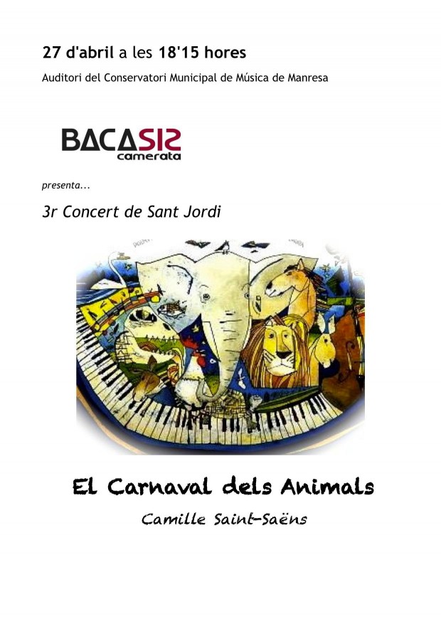 Enguany, la formació musical representarà l’obra: ‘Carnaval dels animals’ de Camille Saint-Saëns. L’acte tindrà lloc demà a les 18:15h a l’auditori del Conservatori Municipal de Música de Manresa coincidint amb la jornada de portes obertes del centre. L’entrada serà gratuïta i lliure fins a omplir l’aforament de la sala.